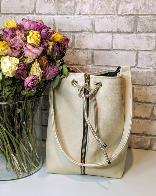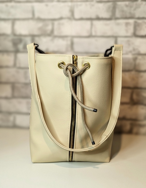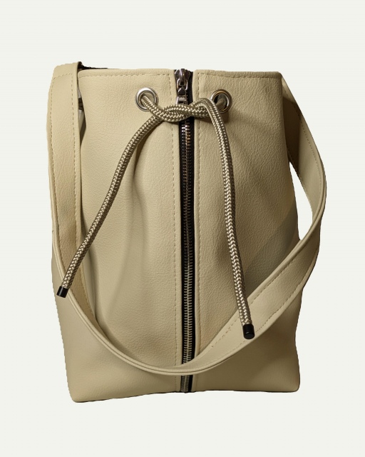 Handgefertigte Handtasche aus beigem, veganem Bio-Kunstleder mit goldigem Reissverschluss und goldigen Ösen