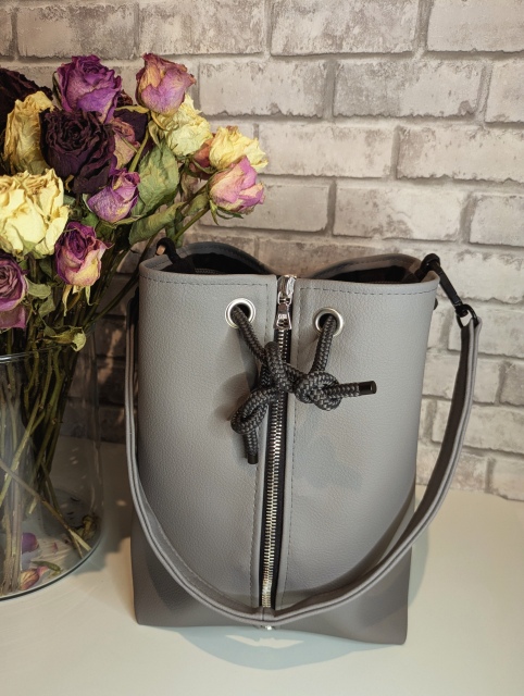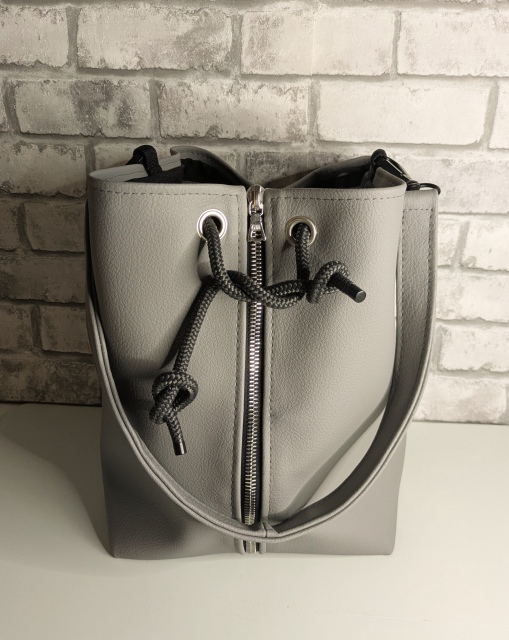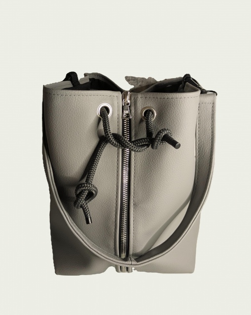 Handgefertigte Handtasche aus grauem, veganem Bio-Kunstleder mit silbrigem Reissverschluss und silbrigen Ösen