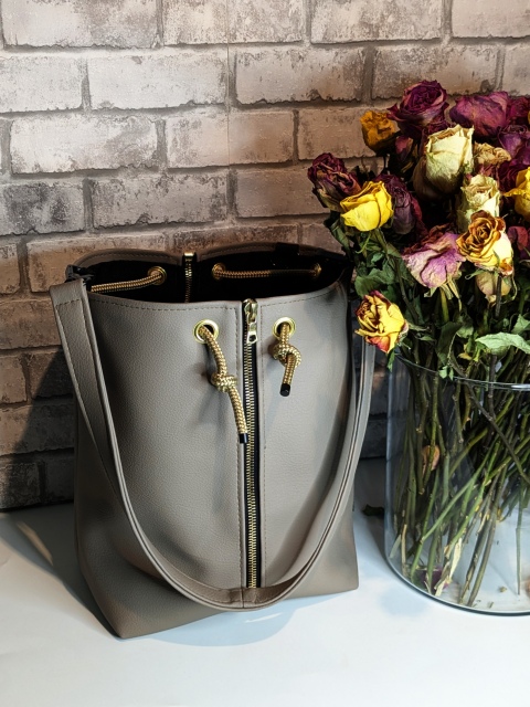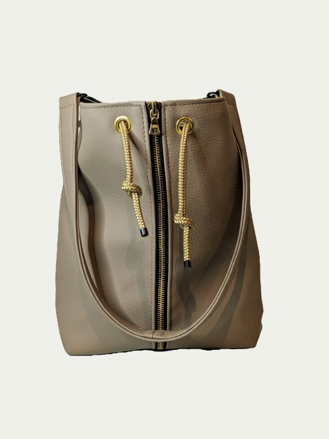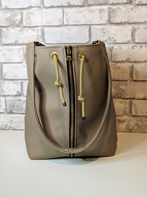 Handgefertigte Handtasche aus moccafarbenem, veganem Bio-Kunstleder mit goldigem Reissverschluss und goldigen Ösen