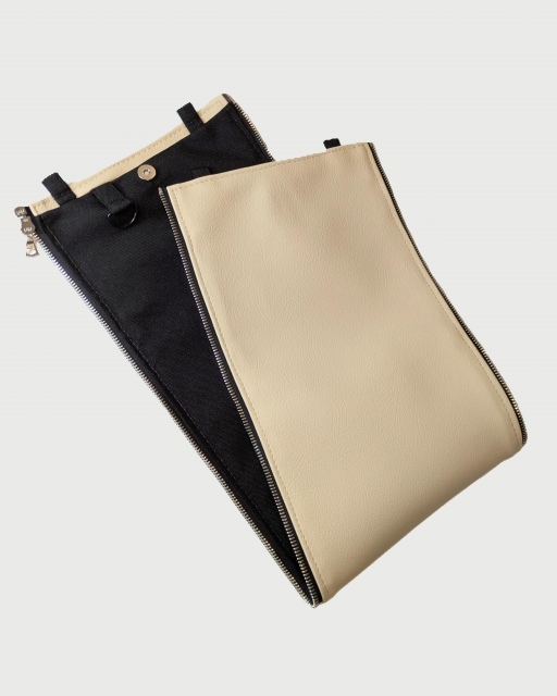 Handgemachtes Mittelteil aus beigem, veganem Bio-Kunstleber mit goldigen Reissverschlüssen