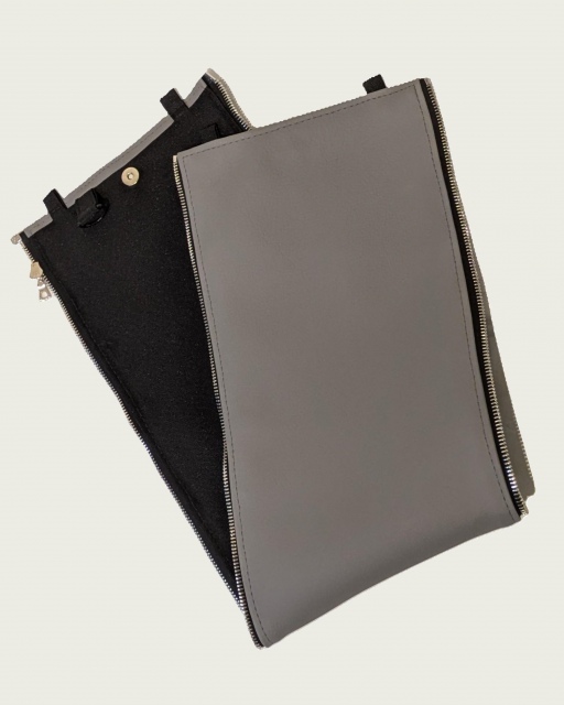 Handgemachtes Mittelteil aus grauem, veganem Bio-Kunstleber mit silbrigen Reissverschlüssen