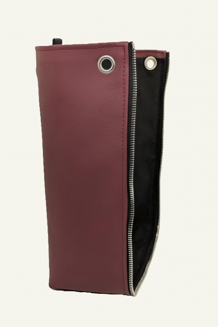 Handgemachtes Taschen-Seitenteil aus bordeauxenem, veganem Bio-Kunstleder mit silbrigem Reissverschluss und silbrigen Ösen