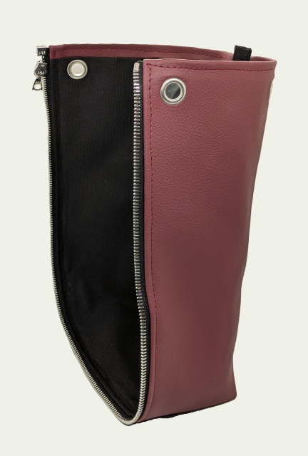 Handgemachtes Taschen-Seitenteil aus bordeauxenem, veganem Bio-Kunstleder mit silbrigem Reissverschluss und silbrigen Ösen