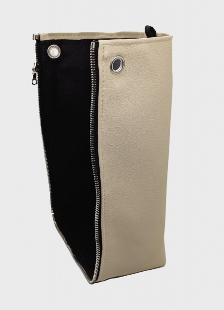 Handgemachtes Taschen-Seitenteil aus beigem, veganem Bio-Kunstleder mit silbrigem Reissverschluss und silbrigen Ösen