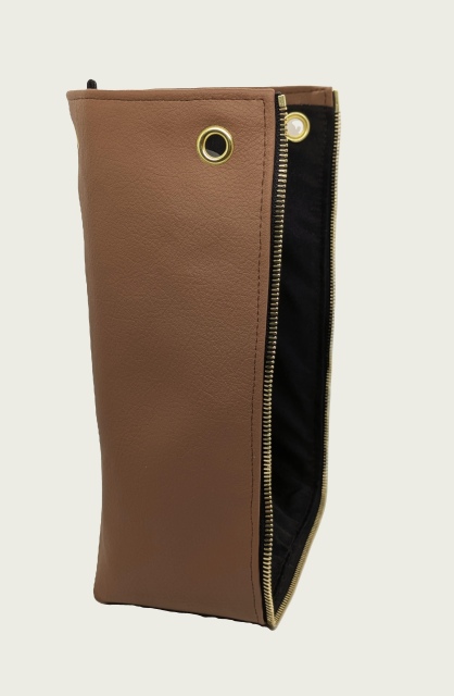 Handgemachtes Taschen-Seitenteil aus brauem, veganem Bio-Kunstleder mit goldigem Reissverschluss und goldigen Ösen