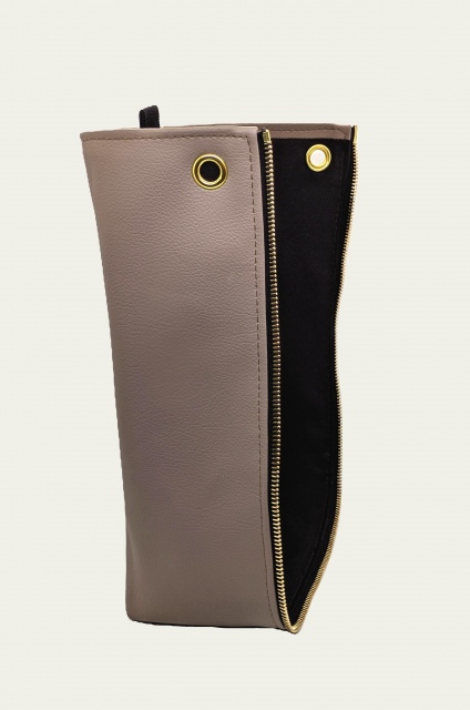Handgemachtes Taschen-Seitenteil aus moccafarbenem veganem, veganem Bio-Kunstleder mit goldigem Reissverschluss und goldigen Ösen