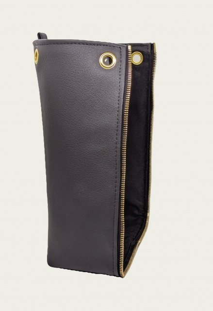 Handgemachtes Taschen-Seitenteil aus schwarzem, veganem Bio-Kunstleder mit goldigem Reissverschluss und goldigen Ösen