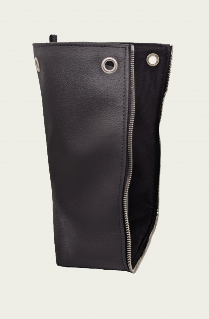 Handgemachtes Taschen-Seitenteil aus schwarzem, veganem Bio-Kunstleder mit silbrigem Reissverschluss und silbrigen Ösen