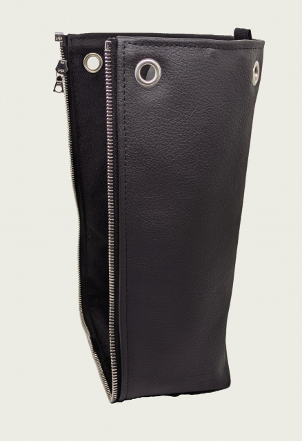 Handgemachtes Taschen-Seitenteil aus schwarzem, veganem Bio-Kunstleder mit silbrigem Reissverschluss und silbrigen Ösen