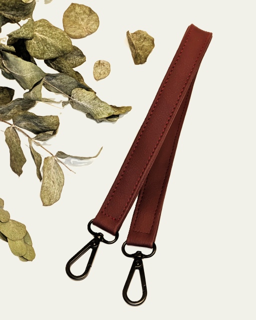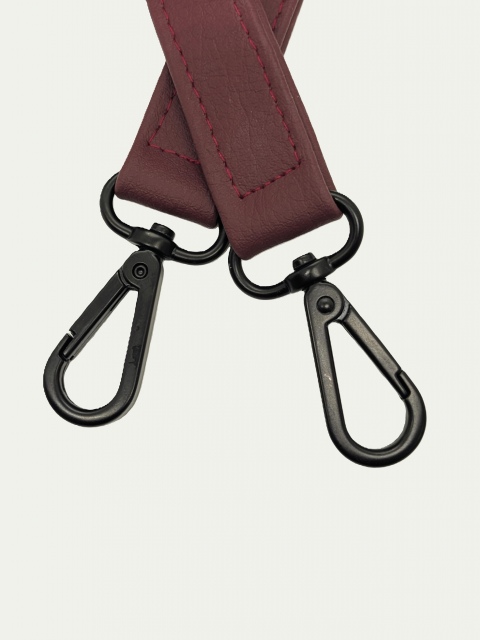 Handgemachter Taschenhenkel aus beere farbenem, veganem Bio-Kunstleder mit schwarzen Karabinern